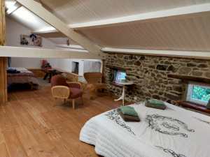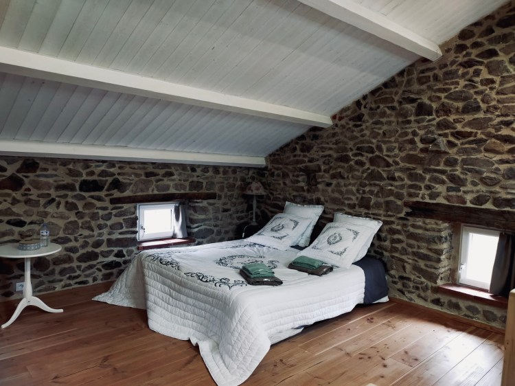 Sous les toits, une grande chambre avec vue sur la forêt et les monts d’Auvergne. Un lit double, deux lits simple, une commode, un espace détente et jeux. Fenêtres et escalier sécurisés.