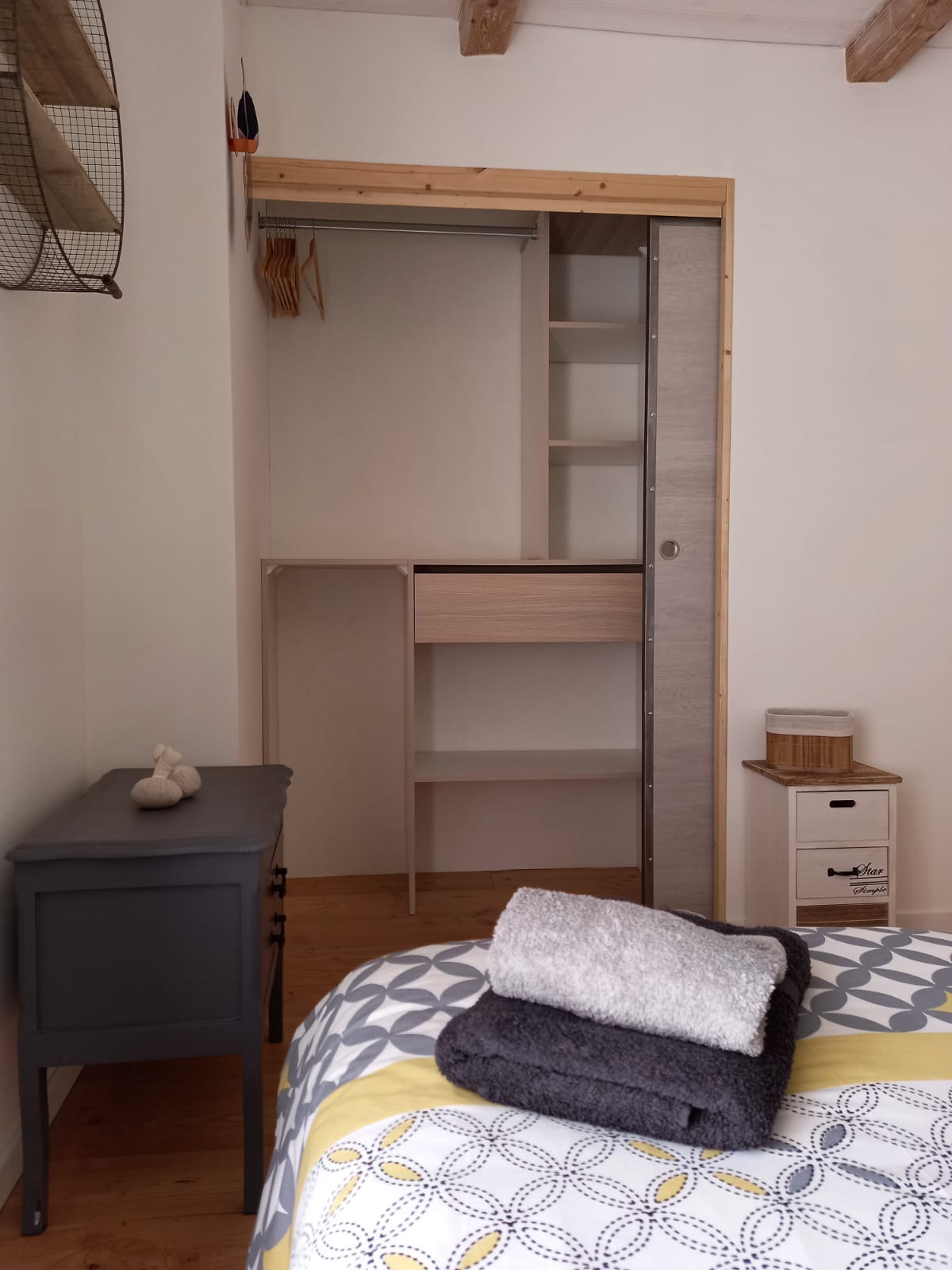 Une troisième chambre avec vue sur le verger et la forêt. Deux lits simple transformable en lit double, grand dressing.