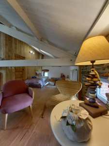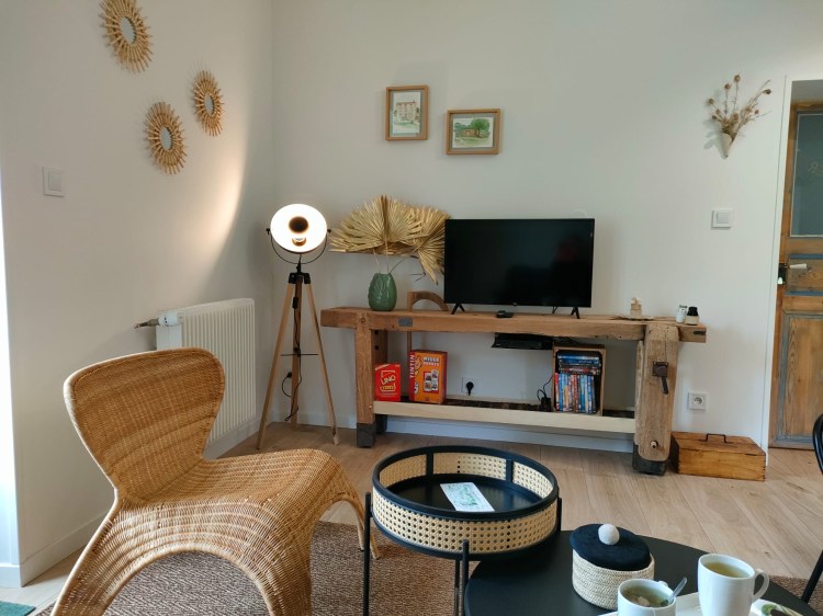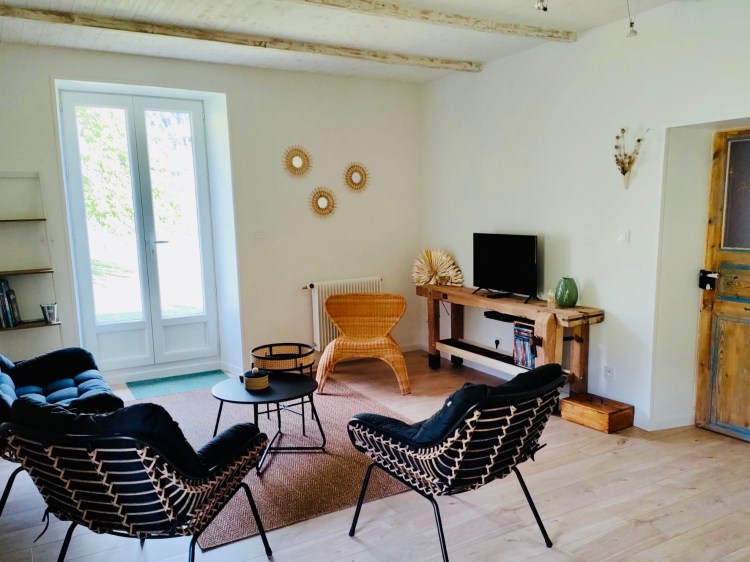 Salon ouvert sur le verger. Equipé d’un espace télévision (lecteur DVD) , de jeux et d’une petite bibliothèque.