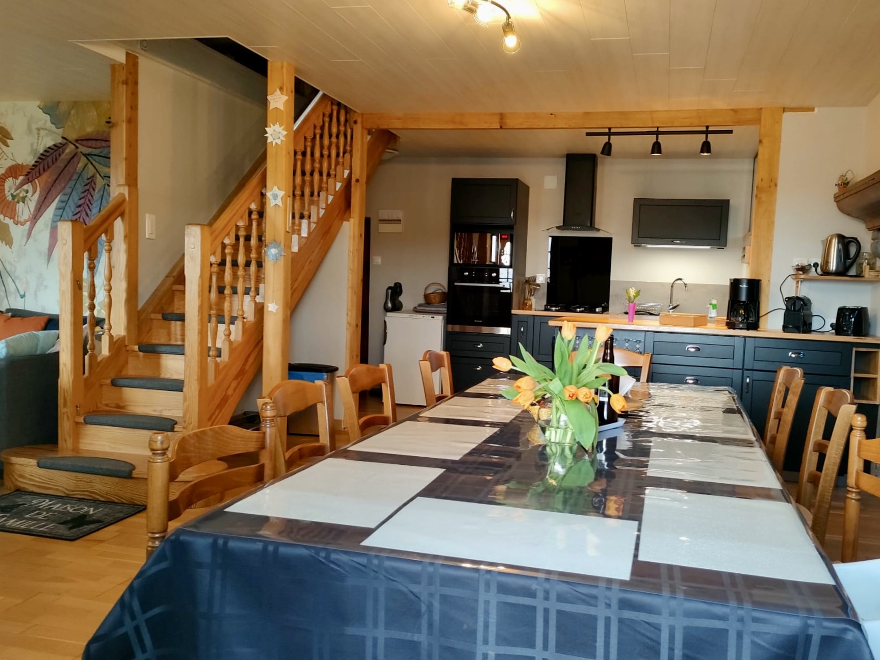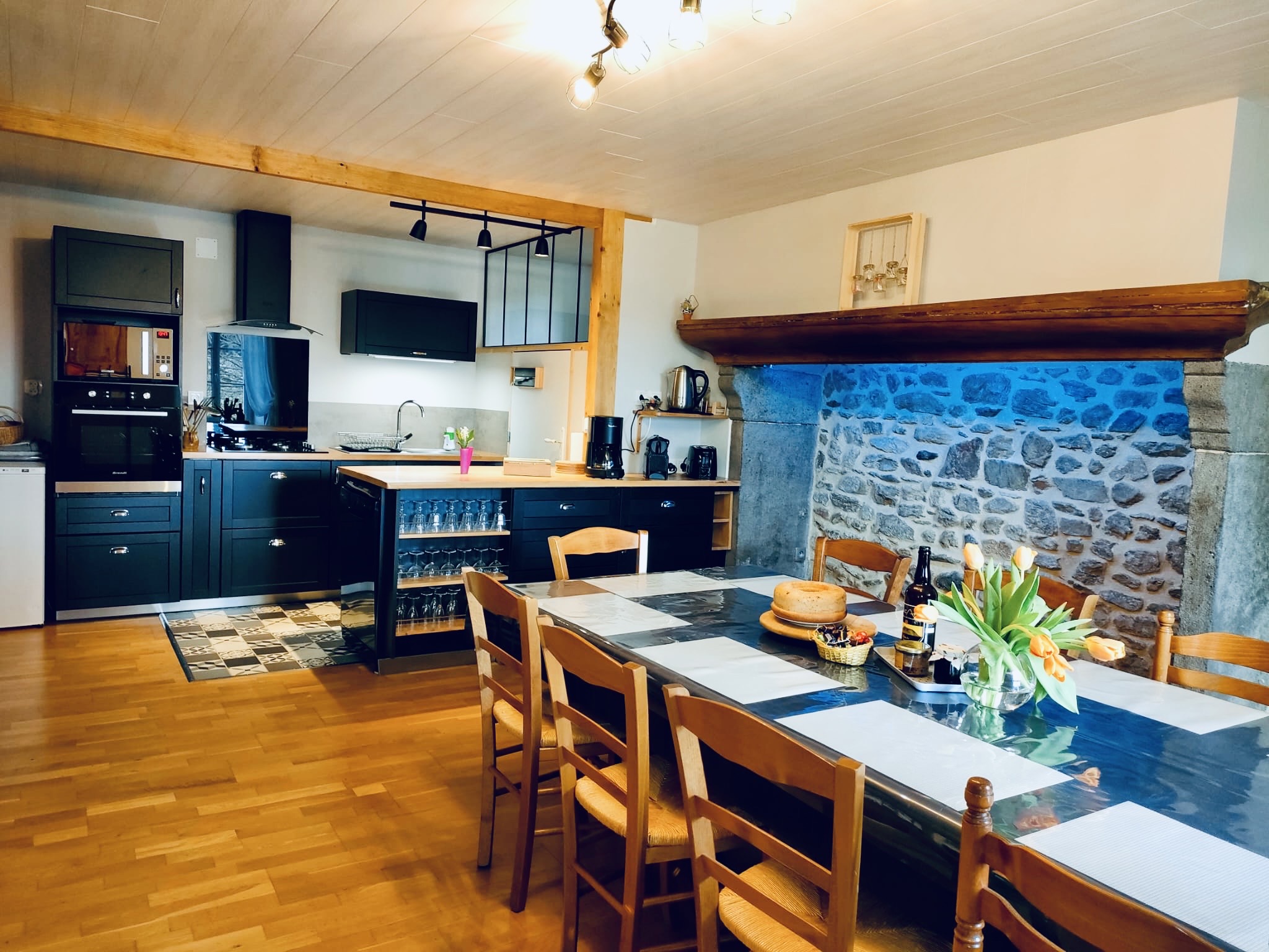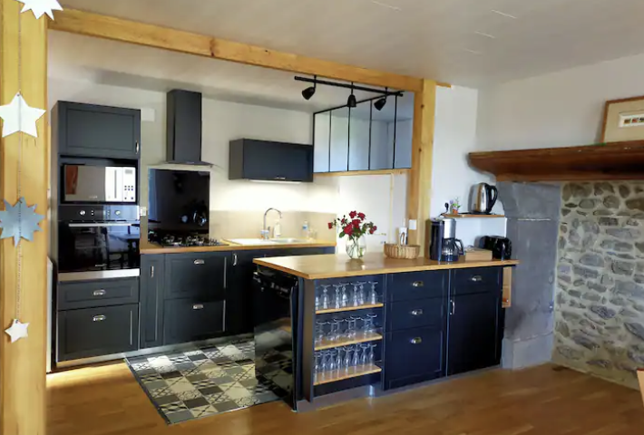 Ouverte sur l’entrée et le séjour. Elle est entièrement équipée : plaque de cuisson, four, micro-ondes, lave-vaisselle, réfrigérateur, congélateur. Vaisselle pour 12 personnes, batterie de cuisine complète, cafetière, grille-pain. Linge de cuisine. Table et chaises pour 8 à 10 personnes.
