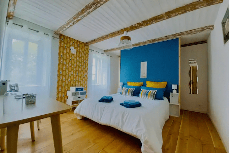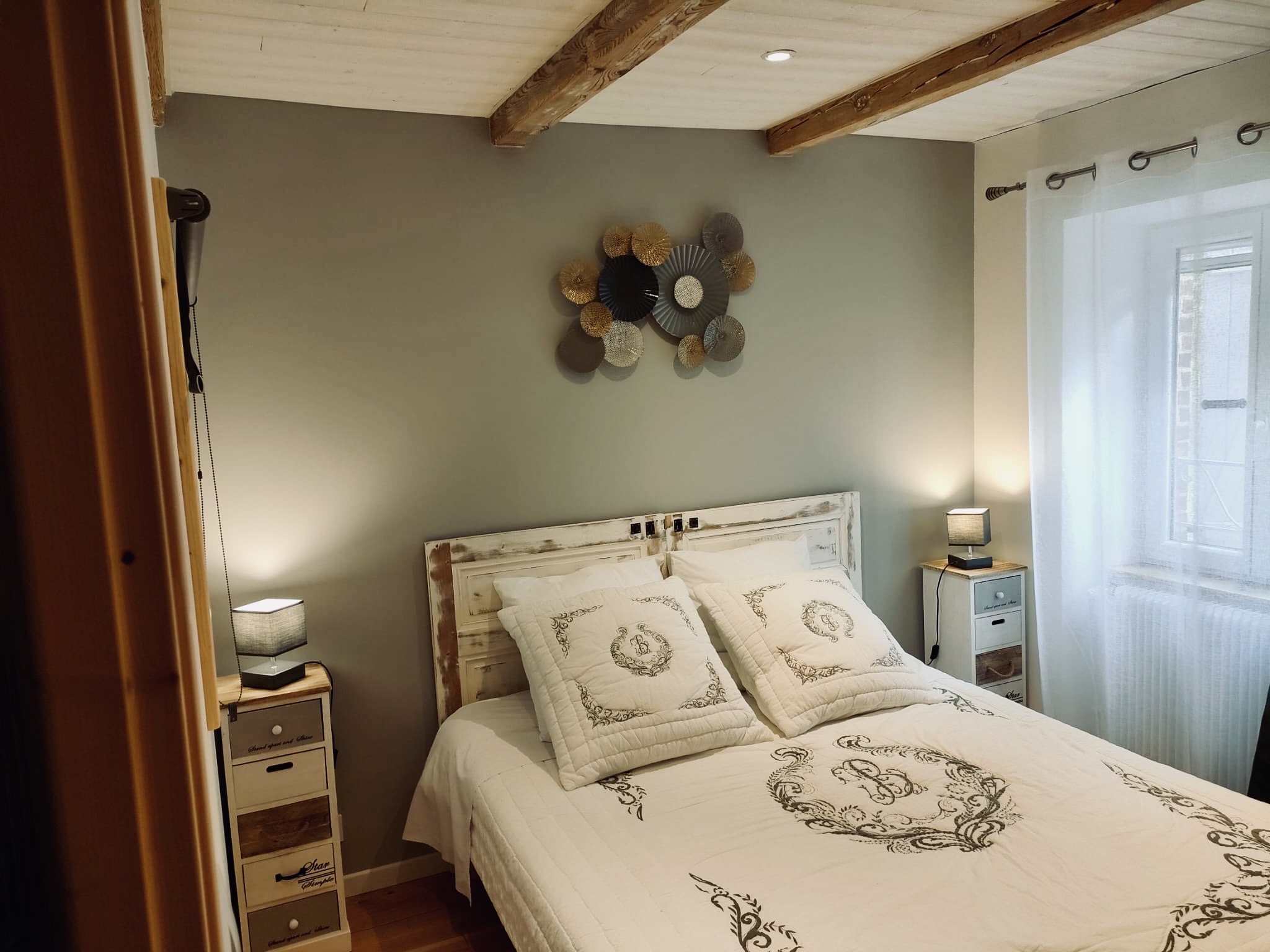 Une grande chambre avec vue sur la terrasse et les monts d’Auvergne. Un grand lit double, double dressing.