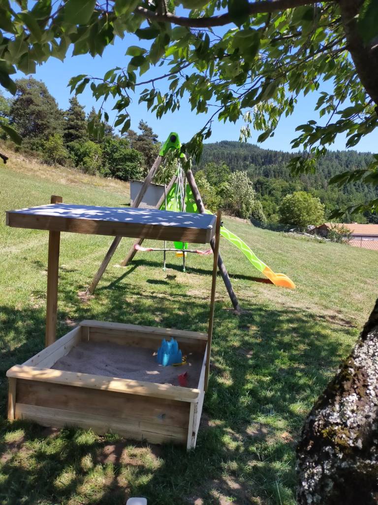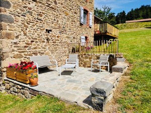 Terrasse éclairée et équipée d’un salon de jardin. Accessible depuis le verger (accès aux espaces et jeux extérieurs).